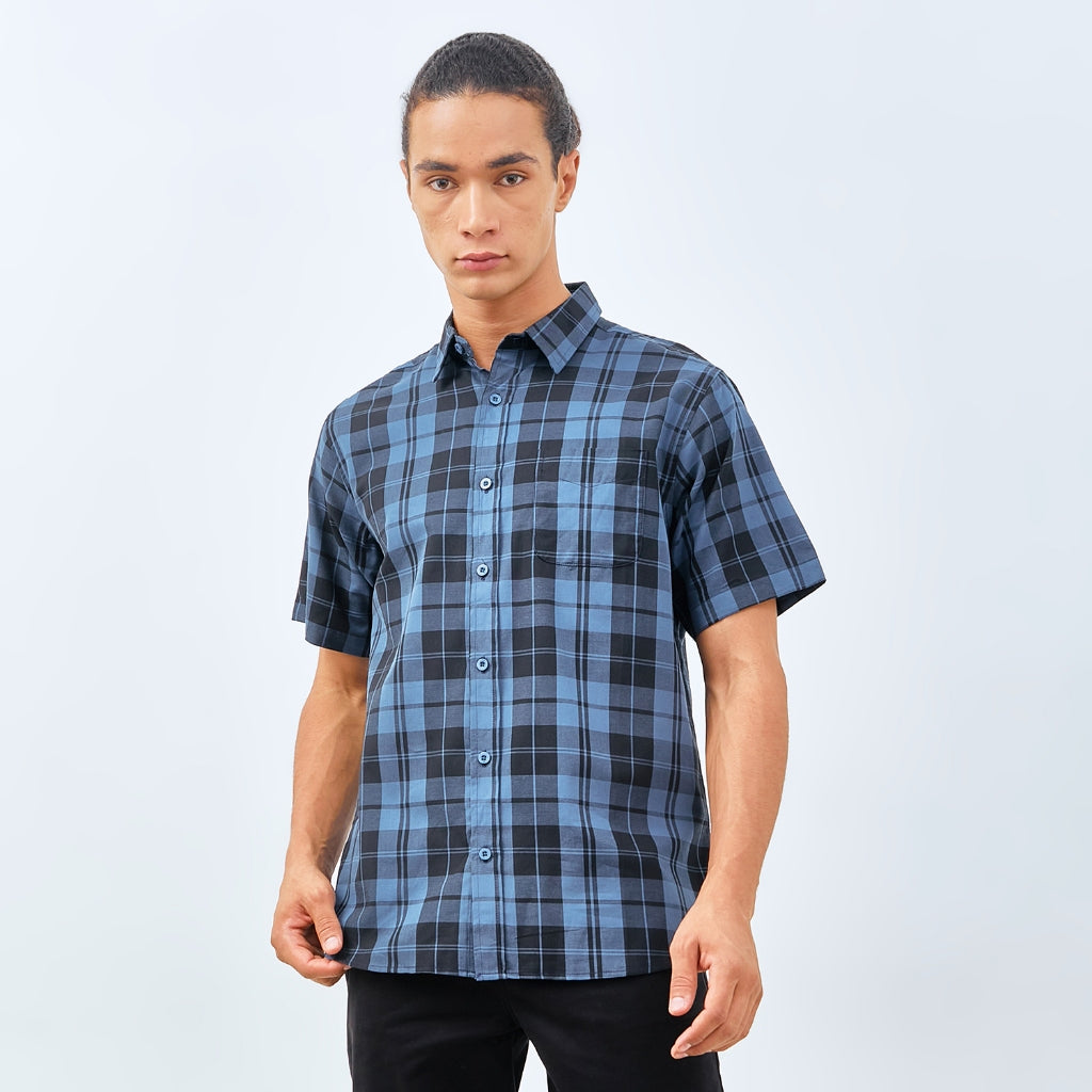 M231 Kemeja Pria Yarn Dyed Kotak Pendek Biru 0176
